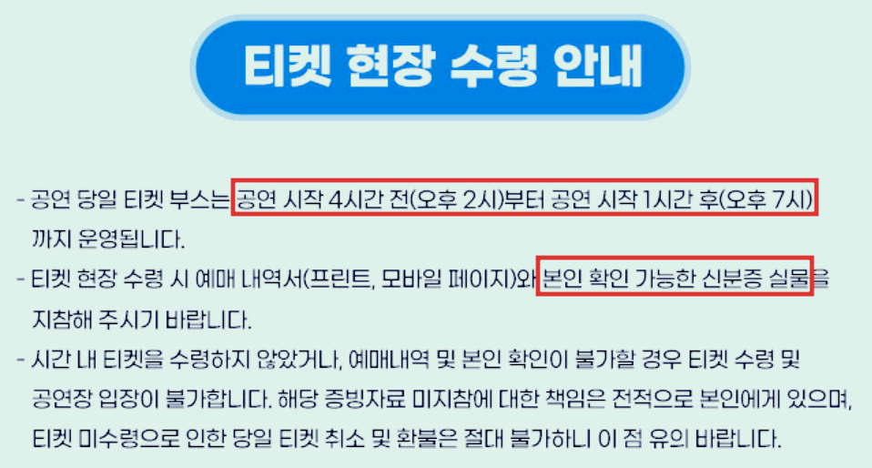 - 할인 티켓은 신분증 및 증빙자료 확인을 위해 당일 현장 수령만 가능함.