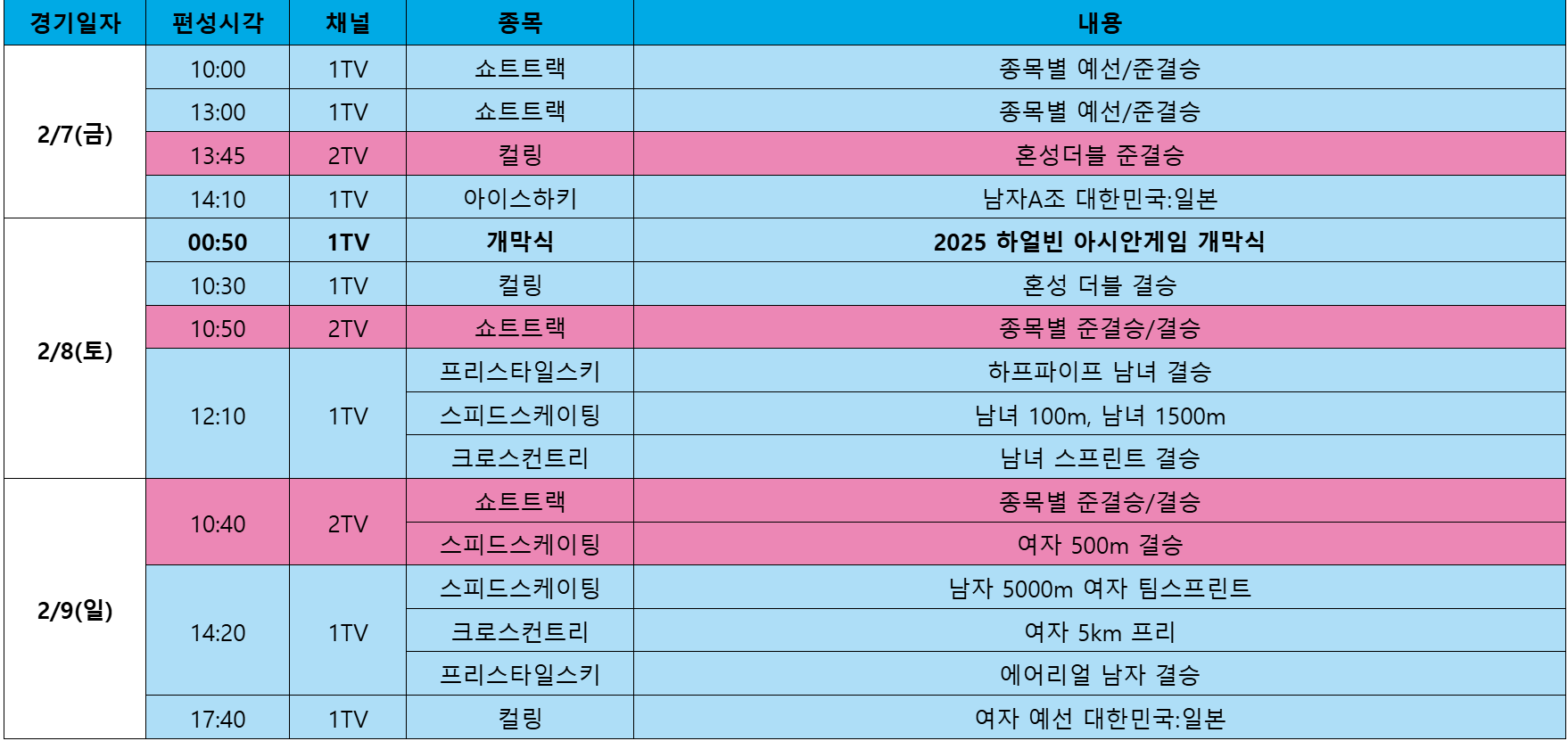 SPOTV의 하얼빈 동계아시안게임 경기 중계방송 일정은 아래와 같습니다.