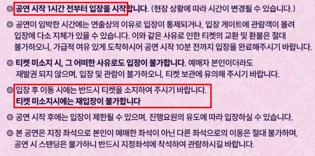 - 무통장 입금으로 예매 시 예매 당일 11시 59분까지 입금하지 않으면 취소됨.