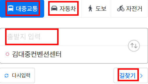 아래 이미지에서 대중교통이나 자동차를 선택하고 출발지 입력 후 길 찾기를 누르면 정확한 교통편을 찾을 수 있습니다.