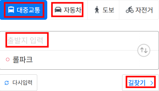 아래 이미지에서 대중교통이나 자동차를 누르고 출발지를 입력한 후, 길찾기를 클릭하면 자세히 볼 수 있습니다.