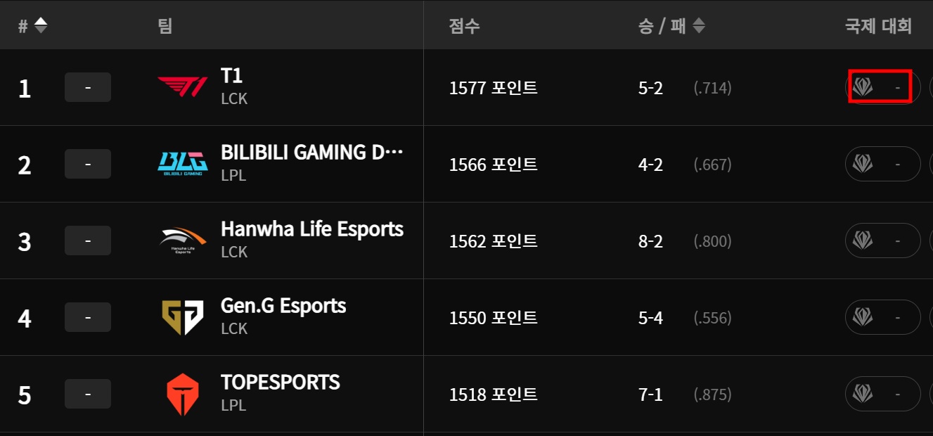 3월 2일, 지역 스플릿 1 이후 새로운 세계 랭킹은 아래와 같습니다. 오른쪽 상단의 붉은 박스를 클릭하면 더 자세한 점수 산정 결과를 볼 수 있습니다.