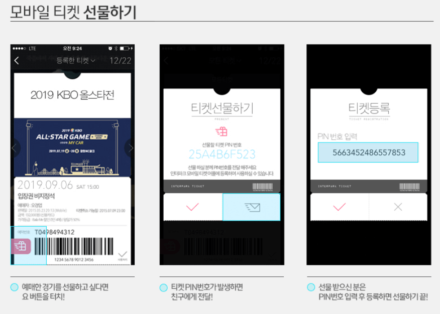 - 친구는 해당 PIN 번호를 입력하여 티켓을 등록하면 선물하기가 완료됩니다.